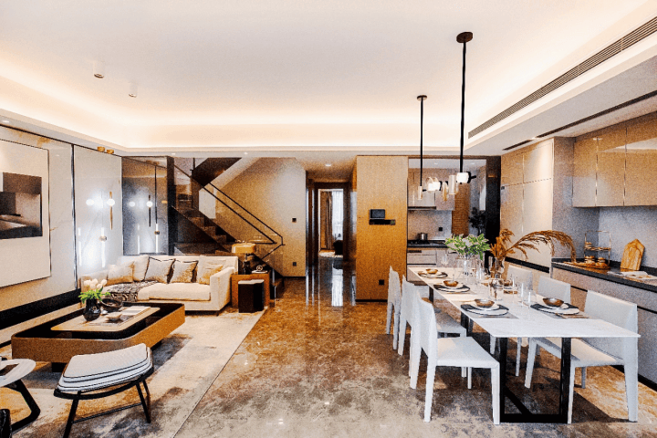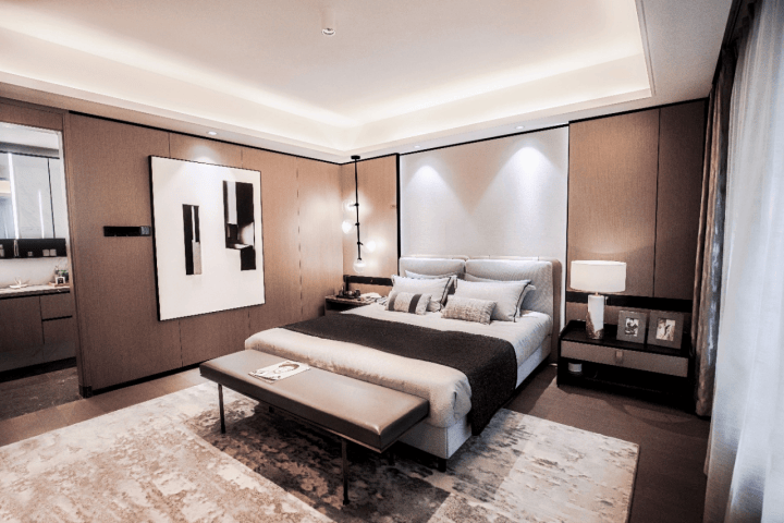 共4层(地上6-8层+地下1层),双归家路线(一层入户大厅/车库电梯入户);六层为餐客厅、厨房;七层为休息区,规划3间卧室;八层为整层南北通透大主卧,北有露台、南有阳台,独享开阔视野与静谧空间。