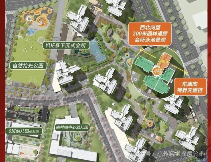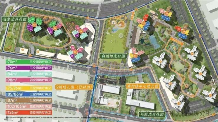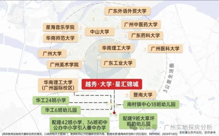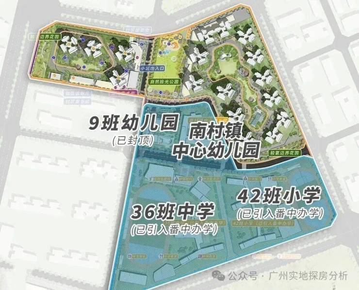 项目配建了一所9班的幼儿园和42班小学和36班初中,总提供3600个学位,该项目已成功引进公办名校番禺中学进行办学,预计2025年9月就能开学。