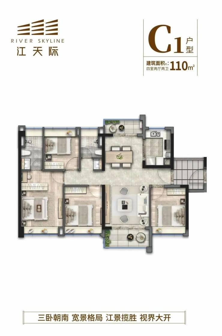 目前江天际除了A1、A4和B栋的商业,其它都在售中,住宅户型涵盖的面积段有78/88m²三房以及110/118/121/134/140m²四房。