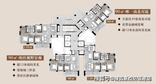 北地块:3栋塔楼(45–47层),建筑密度26.78%,主打90–140㎡高性价比产品,采用2梯3/4户布局,户户南向单边位。