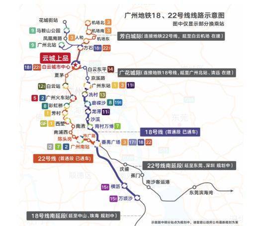 项目最大亮点之一在于其TOD属性与专属归家通道设计。作为18/22号线白云城市中心站(在建)旁的地铁上盖项目,云城上品规划了市面上罕见的专属归家通道,实现与地铁站厅无缝衔接,业主可享受无日晒、无风雨的便捷出行体验。18号线作为“垂直串联广州经济动脉”的超级线路,东接广州东站,中贯琶洲数字经济区,西达珠江新城,南延南沙副中心,构建“1小时湾区商务圈”。22号线则北通白云机场T3航站楼,南达庆盛高铁站与南沙客运港,并通过万顷沙枢纽接入深中通道,实现大湾区核心城市60分钟互达。据戴德梁行2023年报告,此类“四网融合”线路使沿线物业价值提升率达38%。