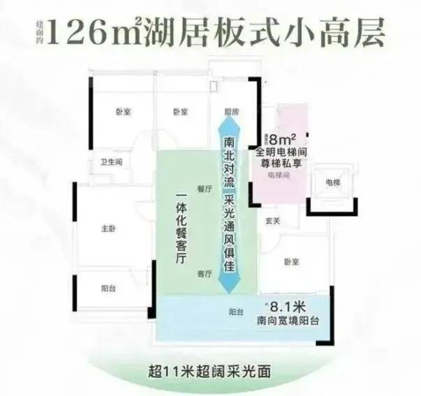 其中 126㎡四房是刚需偏改善的主力户型,2025 年五一期间刚加推,总价约 850 万起,采用三开间朝南设计,LDKB 一体化布局让客餐厨阳台连通,客厅面宽约 4.5 米,主卧带独立卫浴和飘窗,部分楼层能看到湖景,很适合在智谷或珠江新城上班的年轻家庭。