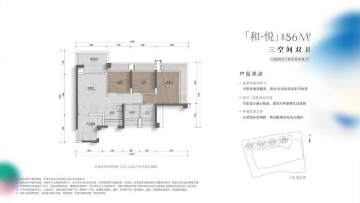 86㎡做三房两卫,LDKB一体化设计。客厅开间3.5米,连接景观阳台,阳台270°采光。板房直接将其中一个次卧打通,打造成书房,形成一个“超级方厅”,购房者也可以将其打造成儿童房。