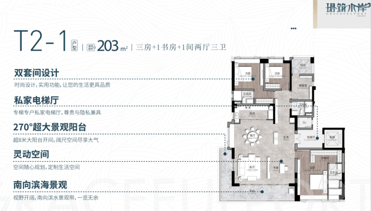 203㎡ 三房+1书房+1间两厅三卫 户型(平层)