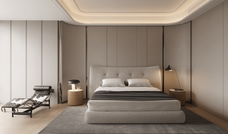 儿子房则展现出另一种个性与品味。打通阳台后,空间更显开阔通透。从床头延伸至阳台的灰色皮革护墙,与微水泥墙面共同构筑出沉稳而统一的背景。一张Poliform Rever床,一把LC4躺椅,不仅是家具,更是审美与生活态度的宣言——在年轻一代的世界里,精致与松弛可以并行不悖。