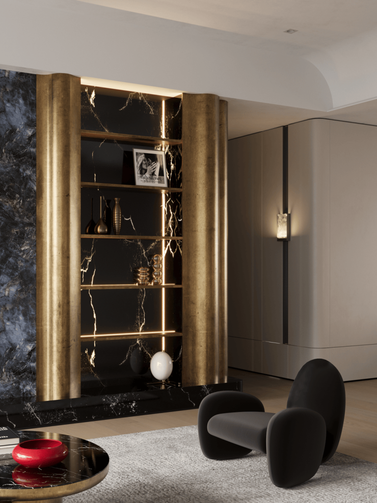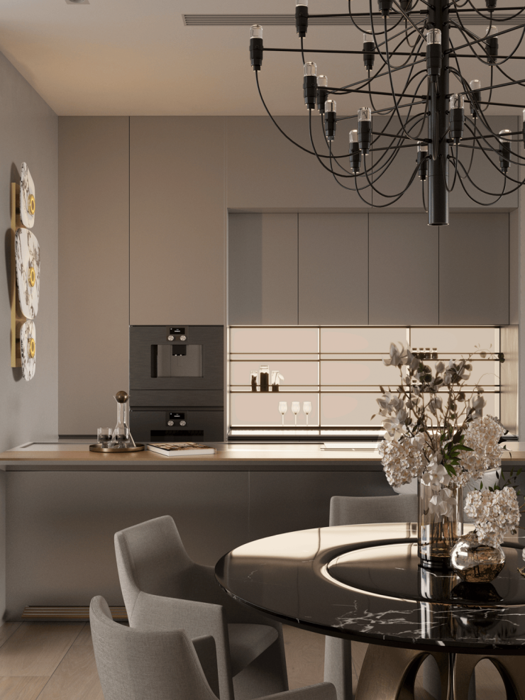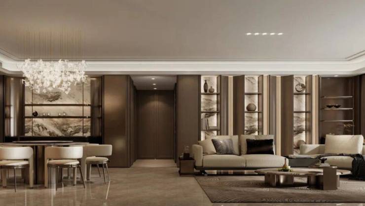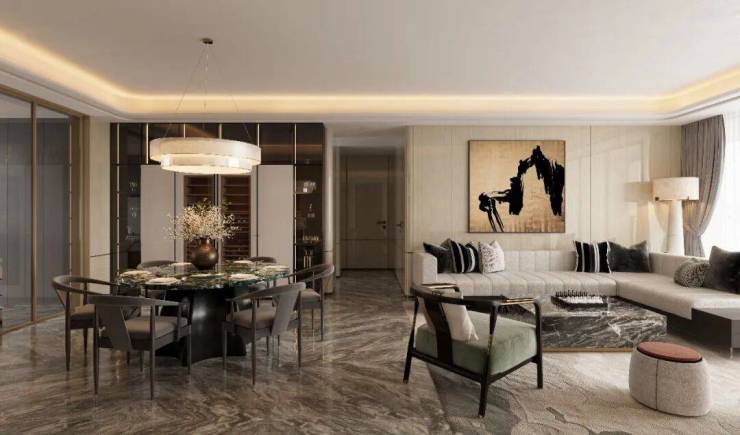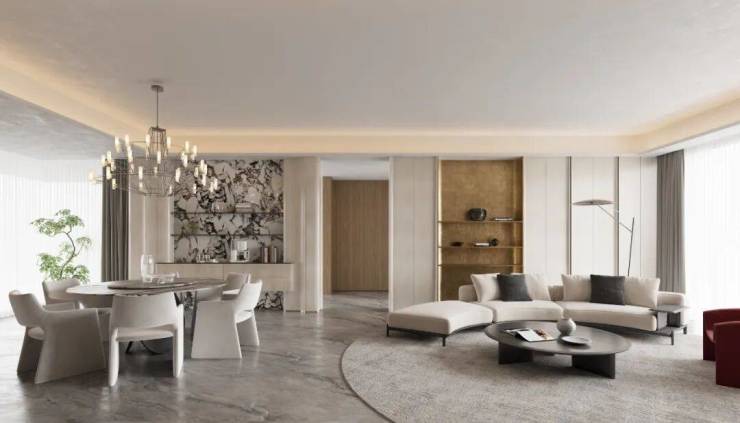 在不进行大拆大改的原则下,我们通过对局部结构的微调,优化了空间的动线与功能分区。中性灰,如同一场薄雾,温柔地弥漫于整个空间,成为连接所有场景的底色。在此基础上,石材的天然纹理、金属的细腻光泽、木色的温润质感依次登场,以克制的对话,共同勾勒出空间的精致轮廓与摩登气韵。