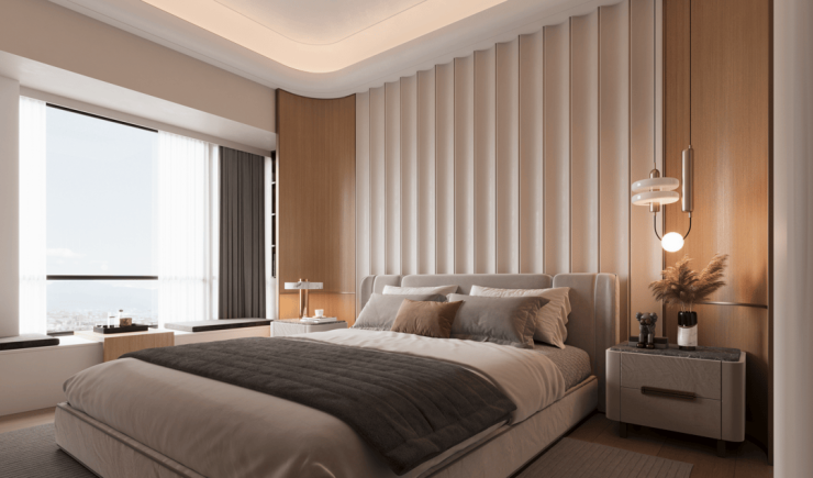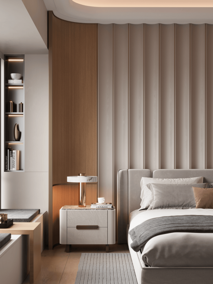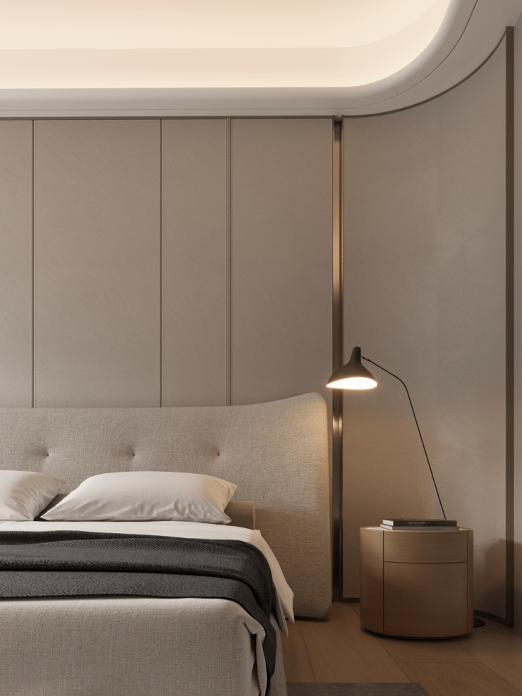 主卧是一个温暖的空间。木色与灰色交织,圆弧造型的床头背景以包裹的姿态,营造出安心入睡的领域。
