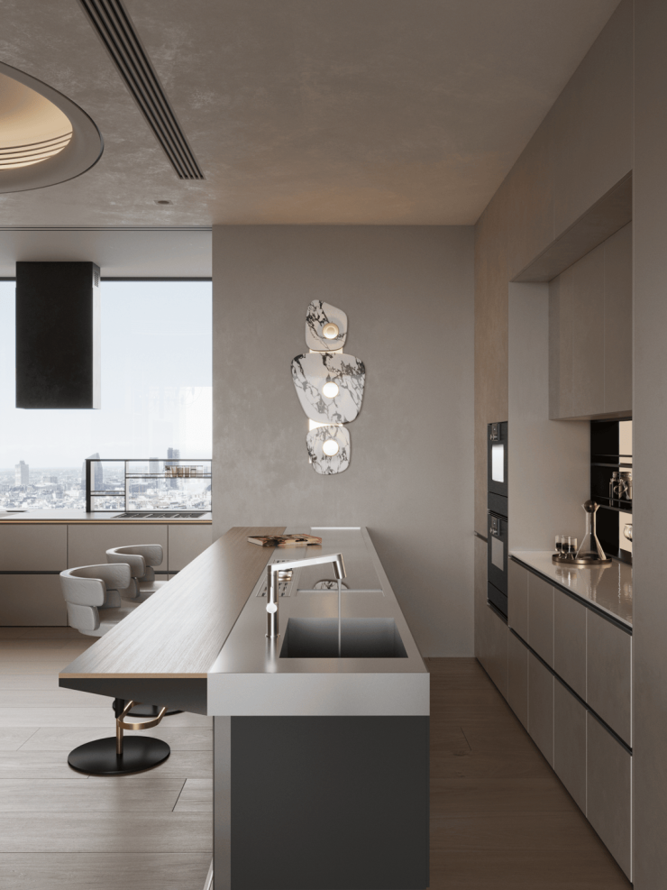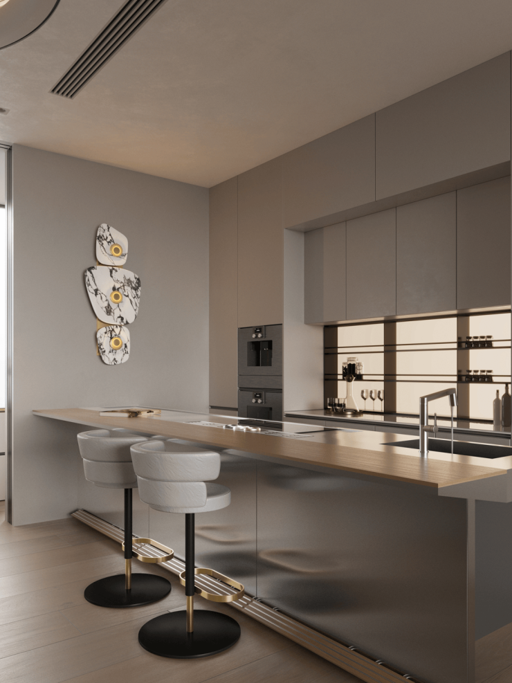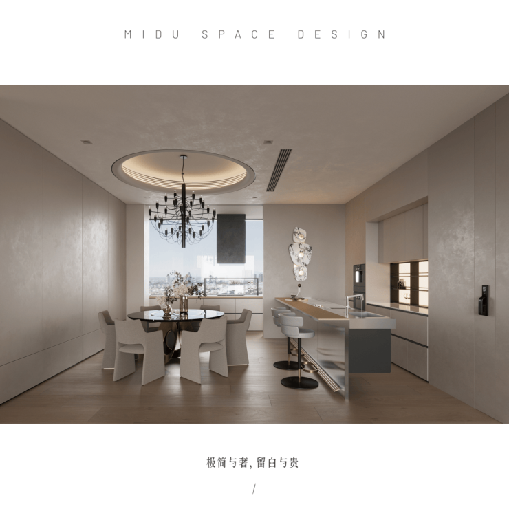 我们将屋主喜好的烘焙、调酒置于多功能水吧台。强大的收纳系统将器具与原料妥帖隐藏,只留下操作台面的从容与整洁。极简,在此并非牺牲功能,而是为了更纯粹地享受过程。