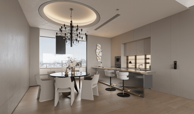 餐厨区域承载着这个家庭最生动的日常场景。生活阳台被封窗纳入室内,厨房入口被巧妙地隐于一侧,映入眼帘的,是一个完整而宁静的餐厨共同体。灰色微水泥从墙面延伸至地面,将水吧台、餐桌与周边柜体无缝衔接,形成一幅功能高度整合却视觉极度纯净的画面。