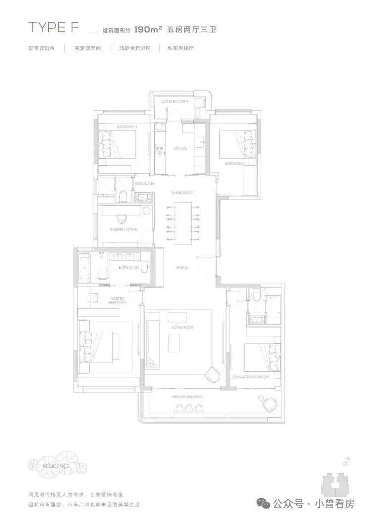 190产品为五房两厅三卫产品,充满了对云端人群生活的独特见解,南向双主卧,中西厨布局,打造纵向超长LDK一体化空间,产品所体现的不只是居住产品,更是特属客群所拥有的生活方式。
