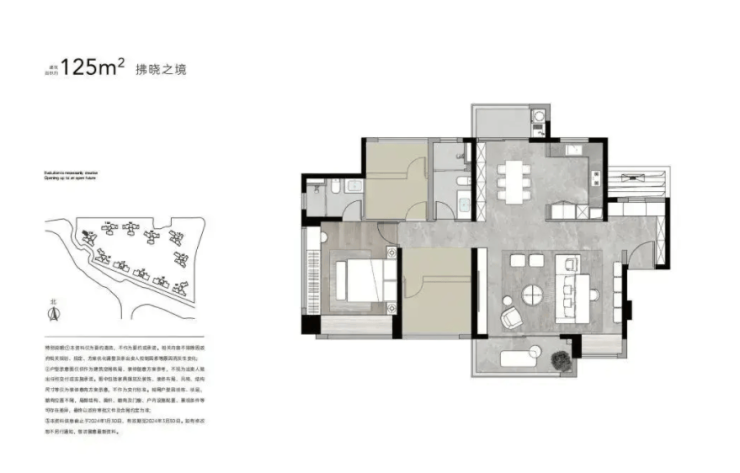 125㎡三房两卫做到了三开间朝南,南北双面采光,客厅连接 6 米景观阳台,主卧带独立卫浴与步入式衣帽间,次卧还预留了收纳柜位置,空间利用率达到 86%,对刚有改善需求的小家庭很友好。