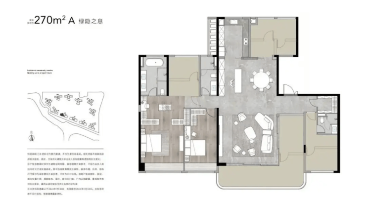最大的 270㎡五房三卫作为顶阶户型,南向面宽达 16 米,10 米 L 型转角阳台能同时俯瞰湿地公园与社区园林双重景观,双套房布局搭配独立家政间,解决了大户型的收纳与私密需求。