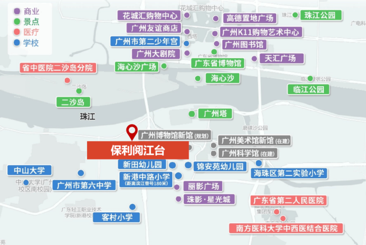 ○ 5大优质学府:广州绿翠实验学校(省级)、广州市第六中学(省级)、新港中路小学(市级)、大江苑小学(区级)、中山大学(重点)