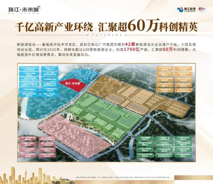 项目位于千亿汽车城板块核芯:周边以广汽集团领衔,已有42家新能源企业落户,2025年将超100家,汇聚10万+科创精英,60万+高薪企业人才。