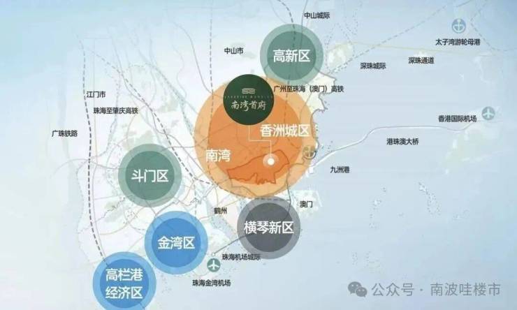 ▫️南湾位居珠海地理几何中心,东面一桥之隔即为香洲老城区,南面与横琴粤澳深度合作区、十字门中央商务区一山之隔;西面规划鹤州新中心;