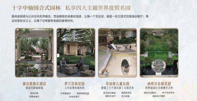 约5000m²十字中轴私享园林:美国比弗利山庄一号为设计蓝本延续城市度假风格,以十字轴线延展,构筑中庭景观泛会所、主题花园等四大主题美境,聚焦全龄成长陪伴,在艺术美境中礼遇美好生活