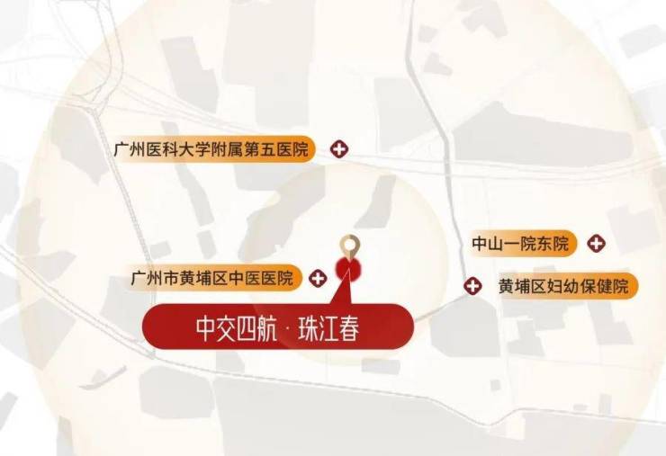 周边 5km 范围内有多家知名医院,如距离 531 米的广州市黄埔区中医医院、距离 1338 米的广州医科大学附属第五医院、距离 1560 米的中山大学附属第一医院(东院)