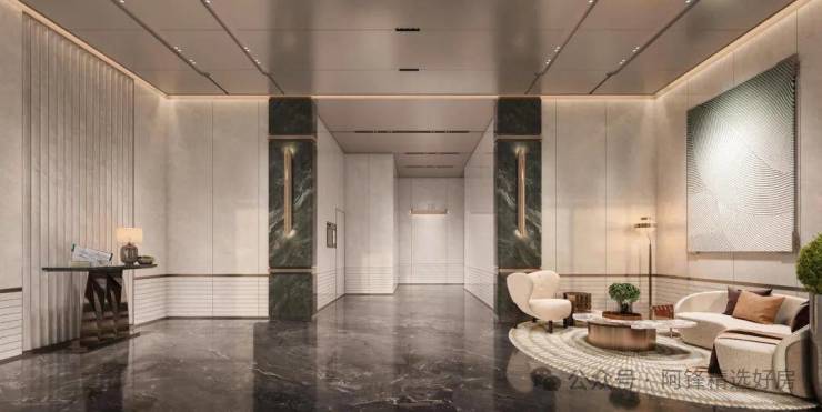 像是星级酒店同款挑高大堂,拉满归家仪式感,金属线条与高档石材互为映衬,视觉观感温润又显高级。