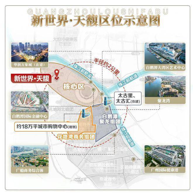 生活配套丰富且高端。项目自带约 4.3 万㎡社区商业,由同源广粤天地商业运营团队管理,让业主在家楼下就能享受电影院、咖啡厅等便捷商业服务。周边商业更是精彩纷呈,全国规模最大的万象城已于 2023 年 6 月开工,预计 2026 年正式营业;太古汇购物中心、太古里滨水街区也分别于 2022 年 9 月动工,2027 年营业。同时,3 公里内 5 所三甲医院环绕,如广州中医药大学第三附属医院(芳村院区)、广州医科大学附属第一医院、广东省中医院芳村医院等,为业主的健康保驾护航。在产品打造上,新世界创新性实践 “开发商 + 四大顶尖设计团队 + 业主代表” 三方共创模式,将豪宅生活方式融入项目,提升业主日常生活体验。