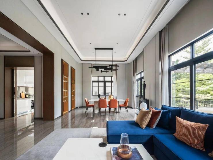 轻奢软饰增强空间呼吸性,深邃格调提升艺术气息。艺术吊灯、典雅陈设、清新原木、奢华石材,深浅呼应的软硬搭配,以爱马仕为主加深蓝点缀,简雅大气而不显沉重。