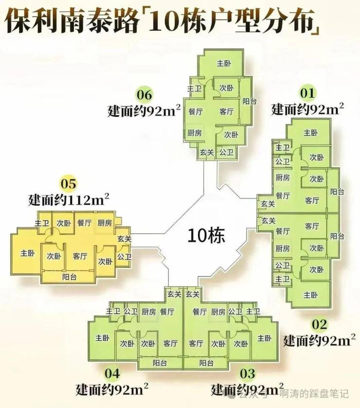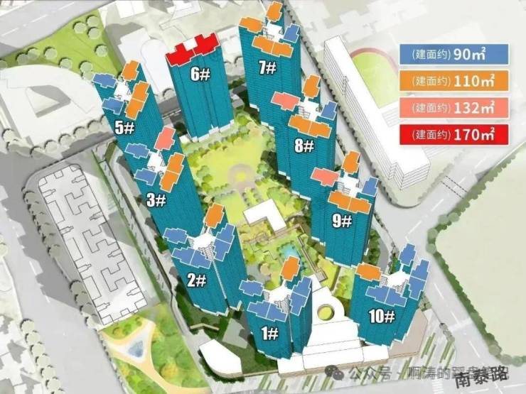 3.楼体形态为塔楼+板楼,板楼作为楼王。将会打造9栋住宅,采用塔楼为主+板楼结合的模式。其中,1栋、2栋和10栋为一层六户,5栋、3栋和7-9栋为一层五户,6栋为板楼设计。