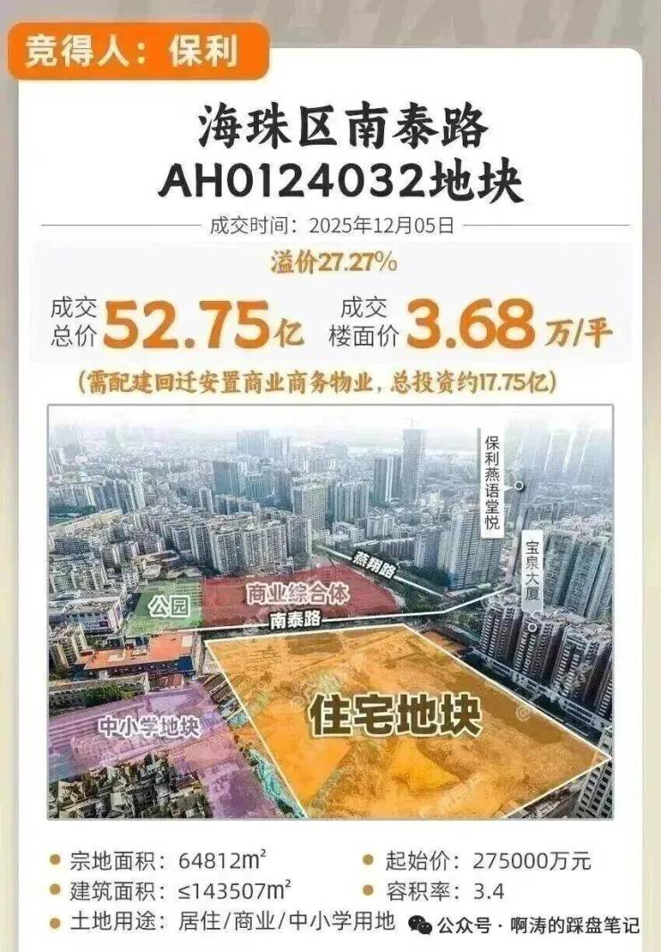海珠西南泰路地块(即翠城花园东地块),经过76轮激烈竞价,被保利以350000万元总价拿下!