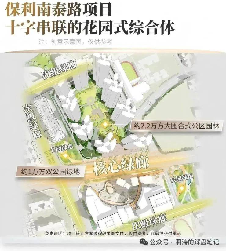 这条十字中轴沿着南泰路两侧展开,把地块南北两侧、住宅区内部的集中绿地串联,构建出约3.2万方社区内大花园 + 外部双公园结构;