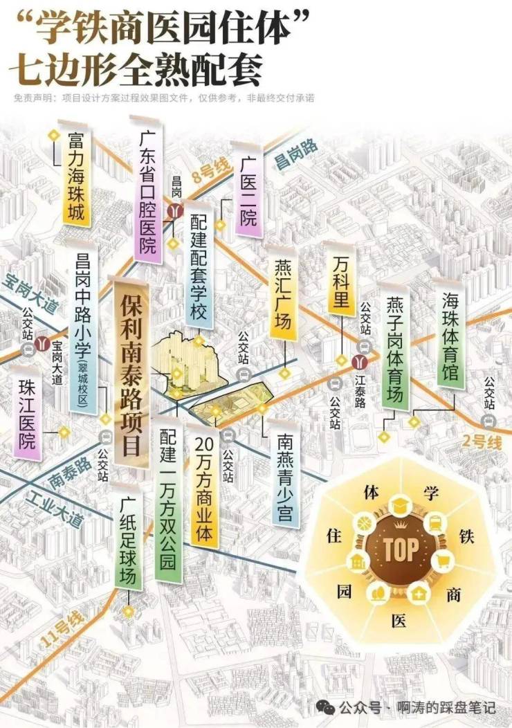 海珠西没大盘,但是保利南泰路地块就是一个38万平综合社区,从配套来看,保利南泰路项目所有牌面筹码都已经摊开——一个“学铁商医园体住”七边形全熟配套圈。