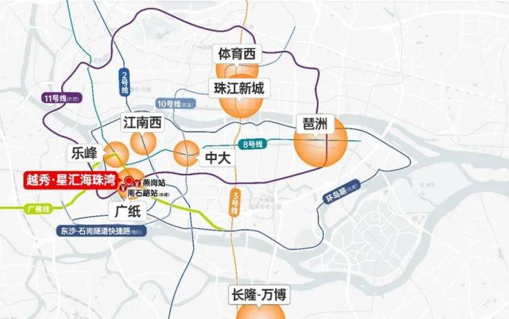 奠基启幕期,定调人居标杆。越秀地产抢占广纸新城绝版地块,依托海珠创新湾发展红利与广纸老城成熟底蕴,规划打造56万㎡大型综合体,涵盖住宅、商业等多元业态,总规划5387户,以“国企保障+全维配套”为核心,奠定项目竞争力[1][2]。400米内直达广佛线燕岗站B出口,临近在建11号线南石路站,20分钟通达珠江新城、琶洲,周边广纸历史公园、滨江公园环绕,奠定“枢纽+学区+生态”三重核心基因[8]。