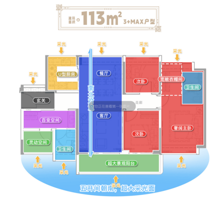 建面约113㎡3+X户型,则更惊艳,南北对流格局,五开间朝南。约6米的观景阳台,阔绰气派,引景入室,超大主卧双飘窗配置,尺度感不错。