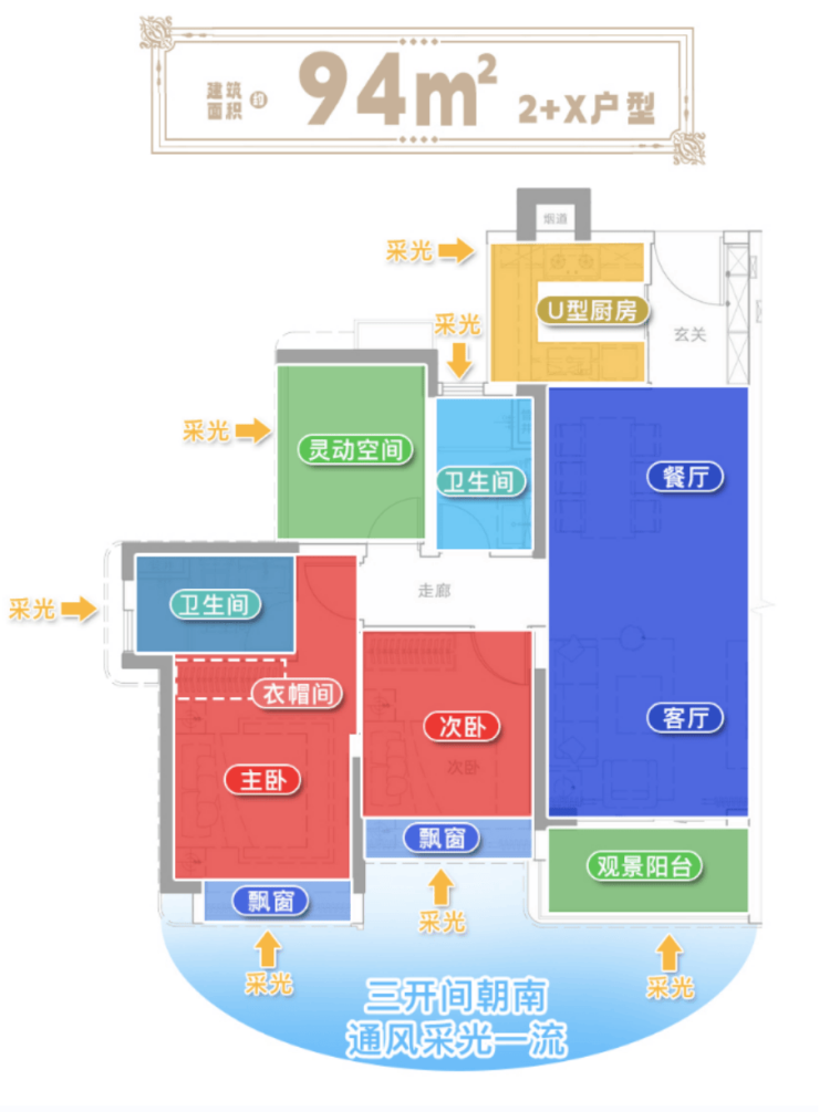 建面约94㎡属于2+X户型,户型方正,动静分区,三开间朝南,悦享小区中央园景景观。卧室均带飘窗,尺度感较好,并且视野开阔。