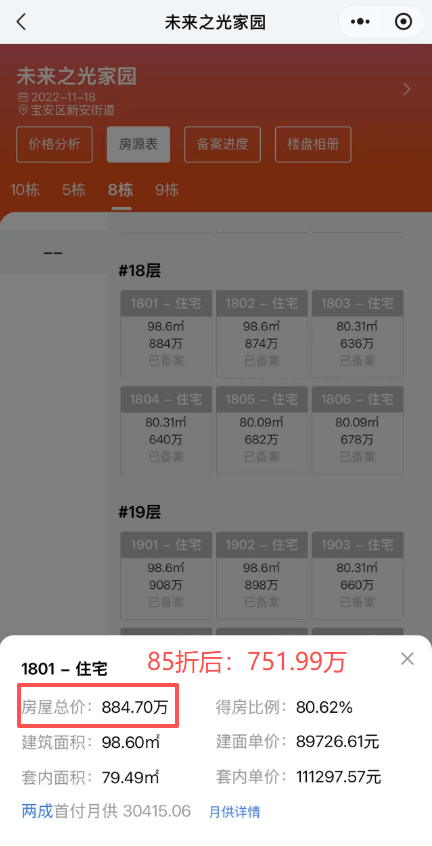该单位业主于2022年项目开盘时购入,原备案价884万元,享受85折优惠后,实际购入价为751.995万元。