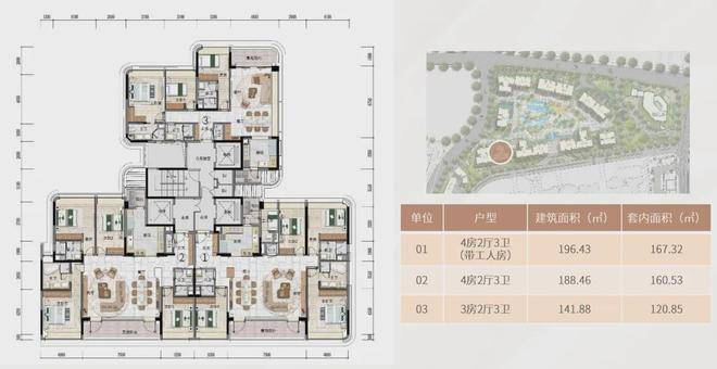 3#、4#、14#则为3梯3户,主要分布的户型为171-196平的三至四房单位。