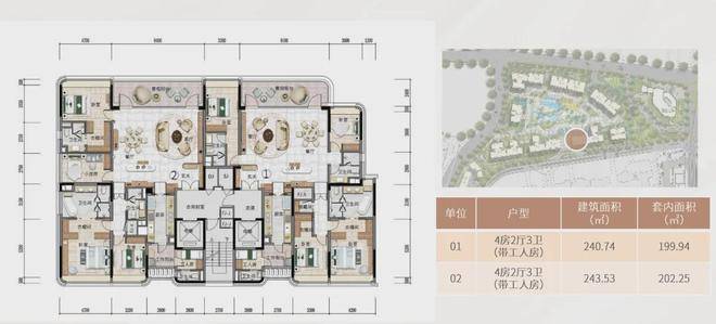 1#、2#均为2梯2户,主要分布的户型为240-243平的四房单位。