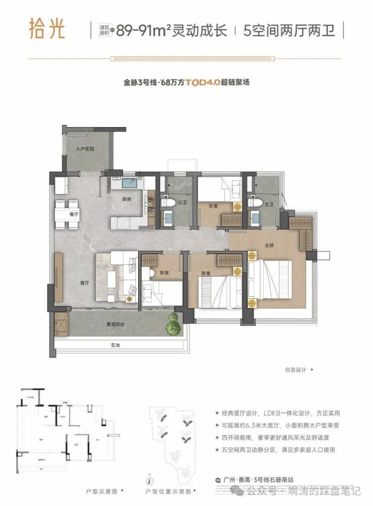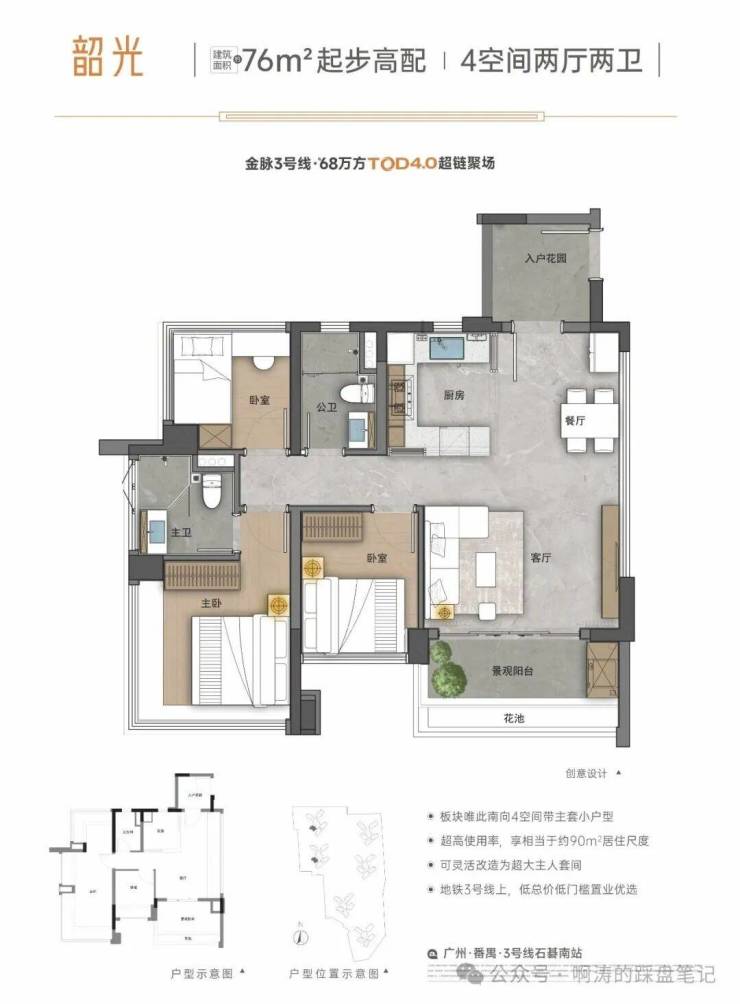 项目整体规划约68万方,是广州地铁地产TOD4.0生活模式首发作品,遵循广州地铁“以城为本,以人为本”发展理念,以品牌“好房子”产品观为基石,以3号线超链城市,为城市兑现品质多元新生活聚场。