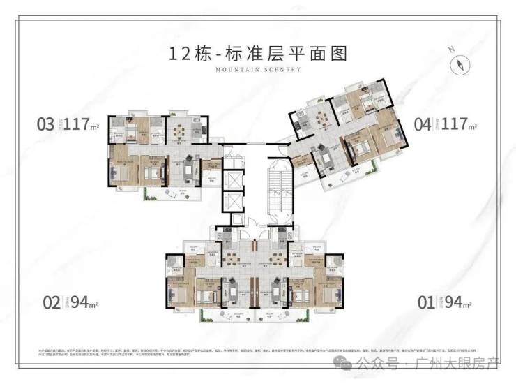 以山景为依托,半围合式布局,每一栋高层朝向皆不同,前后无遮挡,每一户的景色都是独一无二。