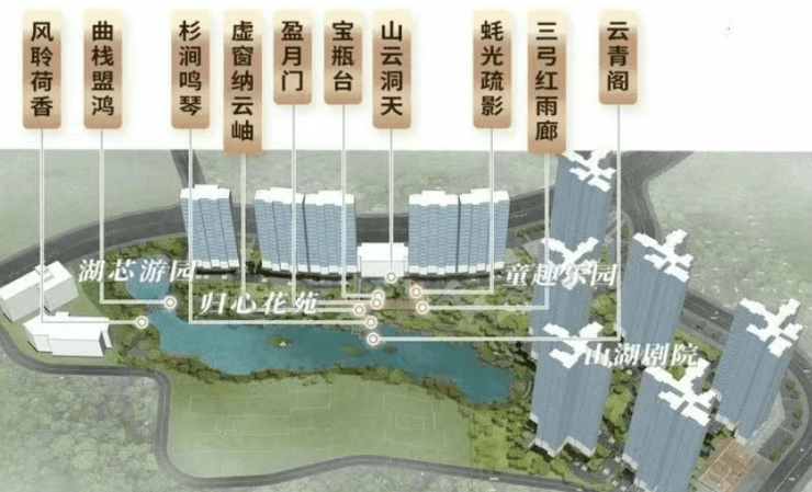 • 园林无界融合:规划 湖芯游园、山湖剧院、童趣乐园、归心花苑 四大主题区。