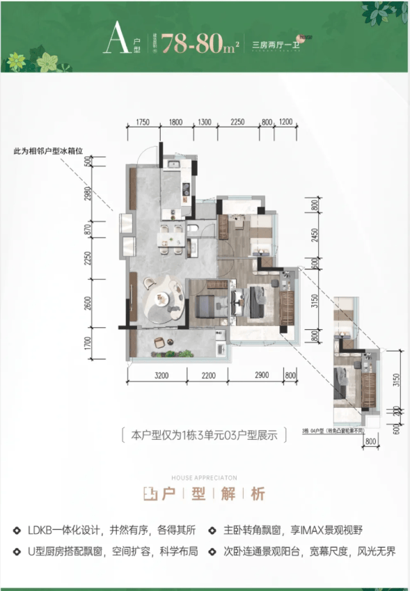 户型方正,动静分离,南北通透,设置宽阔景观阳台,视野开阔,房间布局兼具实用性与美观性,完美适配三代同堂生活。