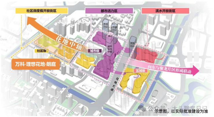 花地中轴,自西向东,串联起社区级微度假开放街区、城市级都市活力区、区域级滨水开放街区三大业态,重塑城市新格局。