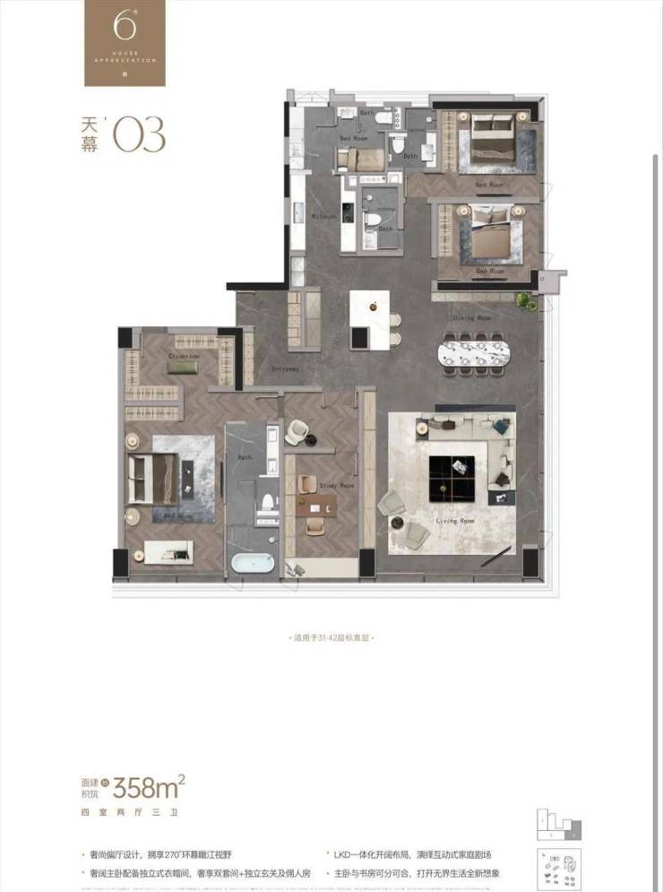 项目一线临江,搭配现代商务全玻璃幕墙,南高北低,最大程度展现一线江景。