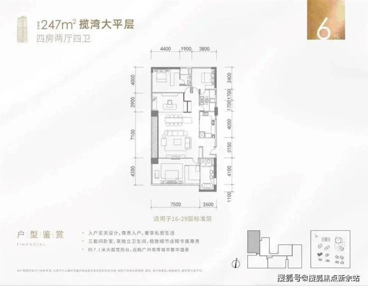 产品方面,项目提供多样化高端住宅配置,满足不同层级的生活需求。叠墅产品位于7栋与10栋,面积区间240-310㎡,为城市中轴线上罕有的南向首排一线江景叠墅,空间层次丰富,居住私密性强;大平层分布于6栋高区至低区,面积段覆盖79-400㎡,其中高区单位具备270°观景视野,尽揽珠江壮阔与小蛮腰天际;中低区单位则打造实用型江景住宅,面宽设计极致优化,5开间朝南,13米以上阳台面宽,营造超阔观江视界。loft公寓位于5栋,面积段为41-110㎡,买一层送一层,精装交付,是市场稀缺的投资型优质产品。另配备写字楼产品,单层面积达1060㎡,整体约4万㎡,匹配城市总部级办公需求,成就金融城商务新地标。