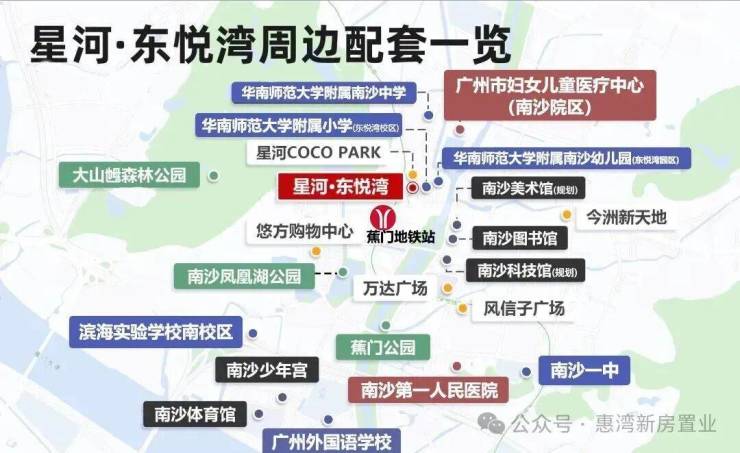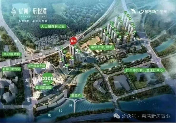 星河东悦湾号称南沙配套之王,学铁商医样样齐全,位置在南沙最中心,是南沙区府旁唯一在售综合体。 小区配建华师附小、华师附中、华师附幼(已开学)和9.7万㎡coco park商业体。