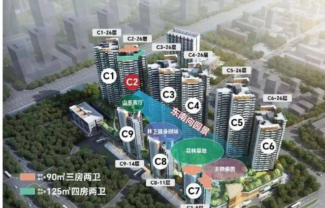 在售户型面积:建面约90/125/160平方米三至五房