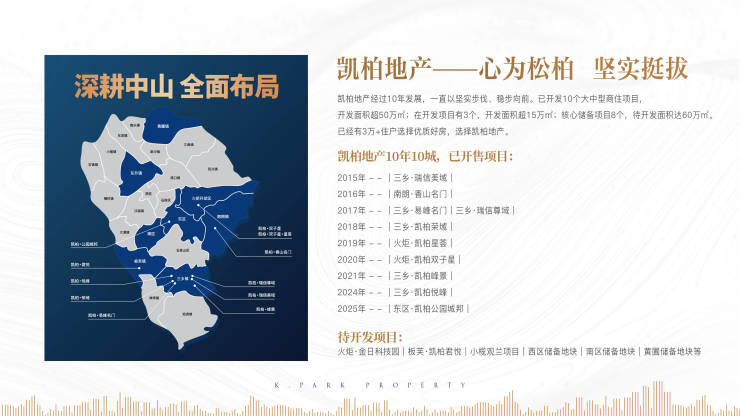 凯柏地产深耕中山 10 载,10 盘经验,60 万方土地储备,专注主城核心区开发,更懂中山人居需求。