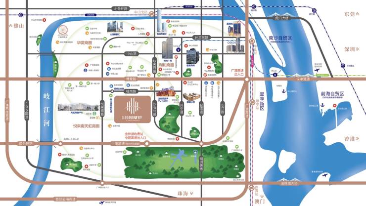 双主干道(博爱路+中山路)环抱,早高峰7分钟直达金融CBD,日常通勤高效便捷;深中通道通车后,45分钟直达深圳机场,1小时通达香港,湾区生活无缝衔接;举步即达在建广铁18号线兴中站,30分钟直抵广州天河,轨道红利赋能便捷出行。