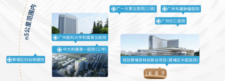 约5公里范围内多家三甲医院环绕:黄埔区中医医院(三甲,建设中),距离项目约500米(数据来源:百度地图直线实测),打造黄埔区首个国家级中医药领域示范高地;中大附属第一医院东院区(三甲);广州医科大学附属第五医院(三甲)等。