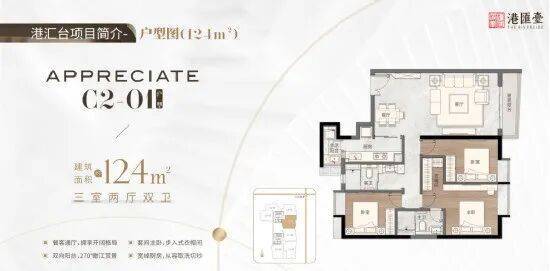 124㎡三房两厅两卫,餐客通厅,拥享开阔格局,套间主卧,步入式衣帽间,双向阳台,270度瞰江赏景,宽绰厨房,从容取洗切炒
