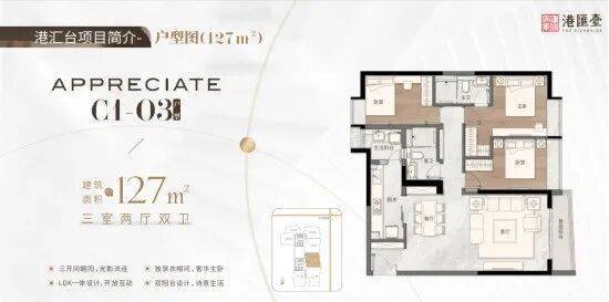 127㎡三房两厅两卫,三开间朝阳,釆光景观无遮挡,LDK一体设计,开放互动,大开间设计,释放更大的活动空调,双阳台设计,诗意生活