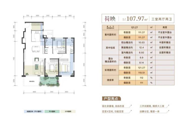 绿城·绿汀芳菲建面约108㎡户型更绝,最大使用面积达到了121.27㎡,室内达到了111.37㎡!