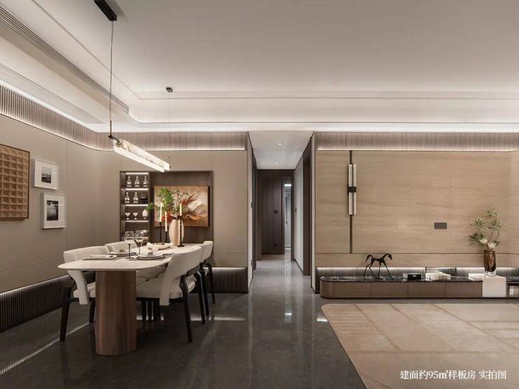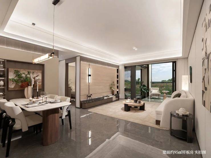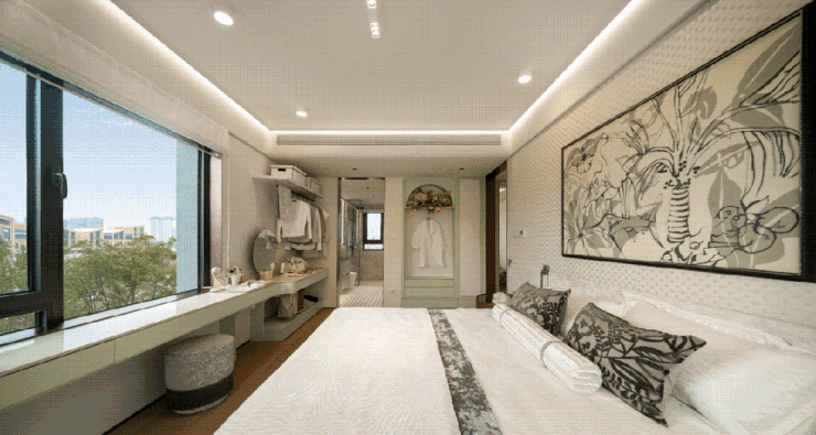 客厅部分,面宽约4.8米,妥妥的宽厅大宅体验,主卧甚至实现270°观景套房,绿汀芳菲在建面约108㎡的入门面积,实现了过往大三房才有的居住体验。
